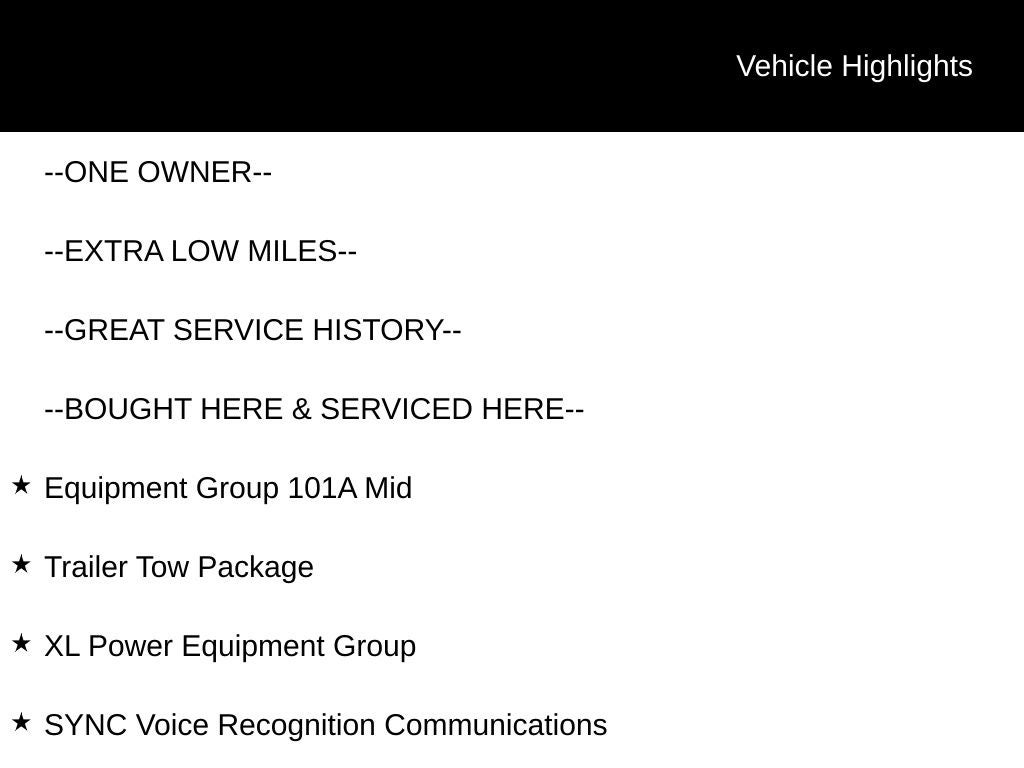 Recent Arrival! --ONE OWNER--, --EXTRA LOW MILES--, --GREAT SERVICE HISTORY--, --BOUGHT HERE & SERVICED HERE--, 4.2 Productivity Screen in Instrument Cluster, Auxiliary Transmission Oil Cooler, BoxLink, Class IV Trailer Hitch Receiver, Cruise Control, Equipment Group 101A Mid, Fog Lamps, Integrated Trailer Brake Controller, Radio: AM/FM Stereo/Single-CD Player, SYNC Voice Recognition Communications, Trailer Tow Package, Upgraded Front Stabilizer Bar, XL Power Equipment Group.
