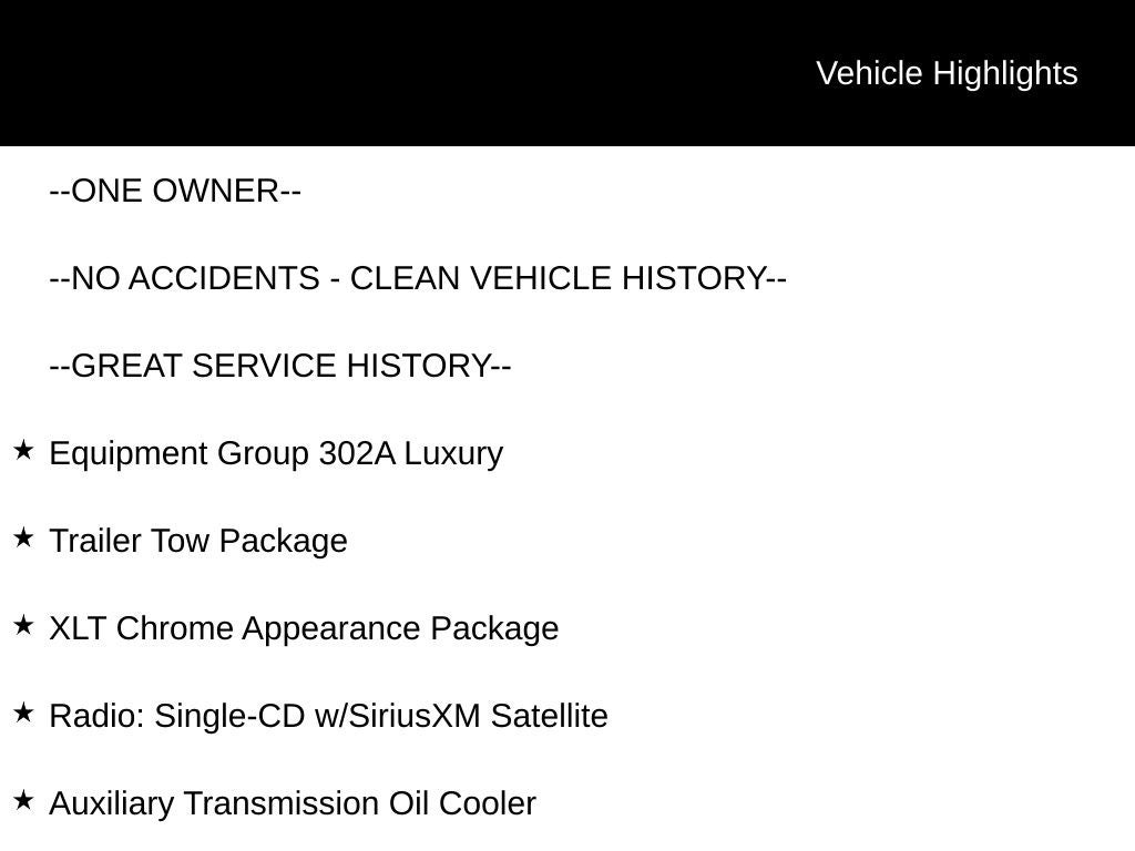 Recent Arrival! --ONE OWNER--, --NO ACCIDENTS - CLEAN VEHICLE HISTORY--, --GREAT SERVICE HISTORY--, 10-Way Power Driver's & Passenger Seats, 110V/400W Outlet, Auxiliary Transmission Oil Cooler, Chrome Billet Style Grille w/Chrome Surround, Chrome Door & Tailgate Handles w/Body-Color Bezel, Chrome Step Bars, Class IV Trailer Hitch Receiver, Cloth 40/20/40 Front Seat, Electronic Locking w/3.55 Axle Ratio, Equipment Group 302A Luxury, Extended Range 36 Gallon Fuel Tank, Heated Front Seats, Leather-Wrapped Steering Wheel, LED Box Lighting, Power Glass Heated Sideview Mirrors, Power-Adjustable Pedals, Power-Sliding Rear Window, Pro Trailer Backup Assist, Radio: Single-CD w/SiriusXM Satellite, Rear Under-Seat Storage, Rear View Camera w/Dynamic Hitch Assist, Remote Start System, Reverse Sensing System, Single-Tip Chrome Exhaust, SYNC 3, Trailer Tow Package, Upgraded Front Stabilizer Bar, Wheels: 18 Chrome-Like PVD, XLT Chrome Appearance Package.