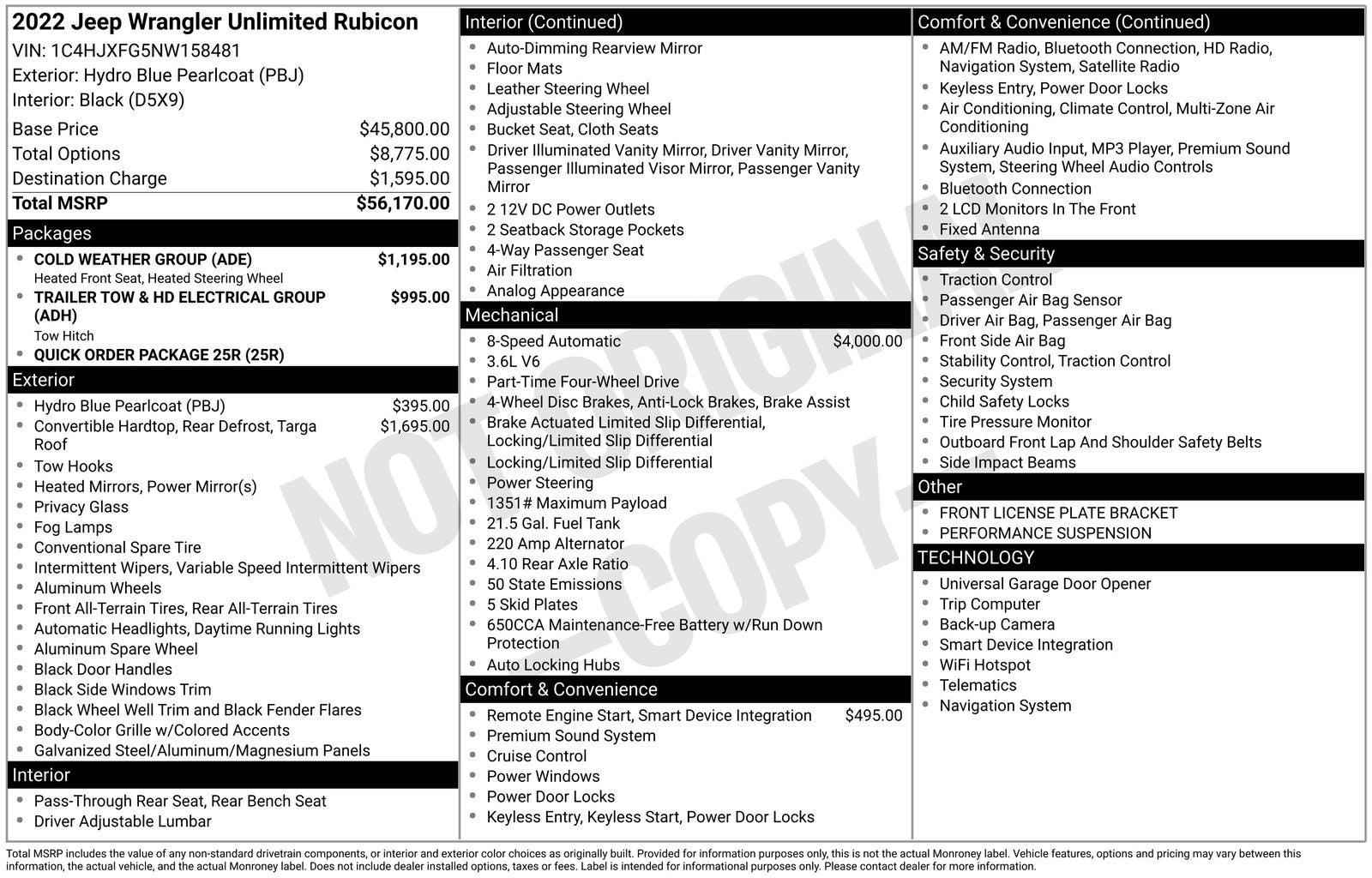 --ONE OWNER--, --NO ACCIDENTS - CLEAN VEHICLE HISTORY--, 240 Amp Alternator, 7 & 4 Pin Wiring Harness, 700 Amp Maintenance Free Battery, Apple CarPlay/Android Auto, Auxiliary Switches, Black 3-Piece Hard Top, Class II Receiver Hitch, Cold Weather Group, Freedom Panel Storage Bag, Heated Front Seats, Heated Steering Wheel, Navigation System, No Soft Top, ParkView Rear Back-Up Camera, Power windows, Quick Order Package 25R, Radio: Uconnect 4C Nav w/8.4 Display, Rear Window Defroster, Rear Window Wiper/Washer, Remote keyless entry, Trailer Tow & HD Electrical Group.