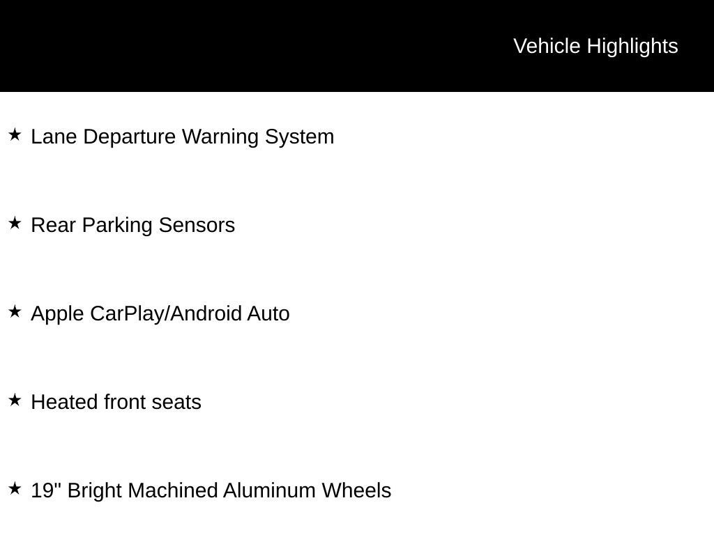 --ONE OWNER--, --NO ACCIDENTS - CLEAN VEHICLE HISTORY--, --GREAT SERVICE HISTORY--, 19 Bright Machined Aluminum Wheels, Apple CarPlay/Android Auto, Automatic temperature control, Equipment Group 200A, Front dual zone A/C, Heated front seats, Lane Departure Warning System, Navigation system: Connected Navigation (3-year trial), Power Liftgate, Rear Parking Sensors.